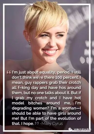 “一切为了平等,句号。我始终觉得我们并没有100%做到这一点。男性饶舌歌手总是手抓裆部,被一大群姑娘围着,没人觉得有什么问题。但如果我手抓裆部,被一大群热辣超模围着,我就是在给女人丢脸?我是女的——身边有一群女孩们是理所应该的!但希望我是这场革命中的一个部分。”