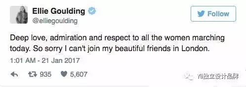 埃利·古尔丁:深爱,钦佩和尊重所有今天游行的女人们。非常抱歉我不能加入在伦敦的美丽的朋友们。
