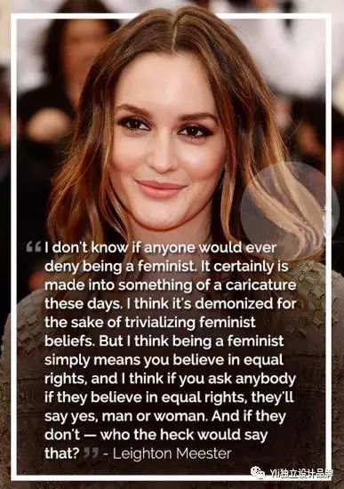 莱顿-米斯特:“我不知道还有人会否认自己是‘女权主义者’。这总是讽刺漫画的好题材,我想这些都把女权主义者妖魔化了。作为一个女权主义者,只不过说明你信奉平等,我不觉得如果被问到你是否相信平等时,有人会说不,如果真的有——到底什么样的人会这么回答?”