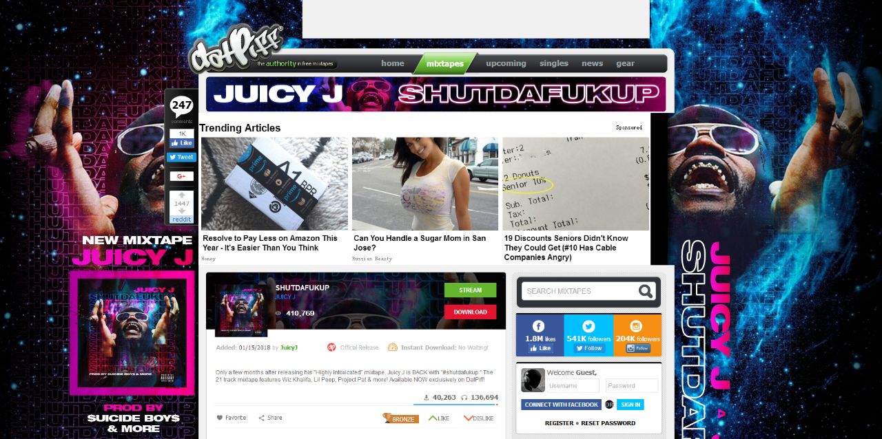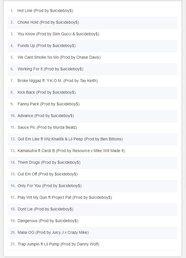 而Juciy J最新专辑《Shut Da Fuk Up》已经在DatPiff官网正式发行,由Suicide Boys等大牌制作人制作的该专辑绝对算得上重磅,总计21首单曲中也有不少大牌歌手/Rapper参与,除了让人激动的Wiz Khalifa以外,更让人惊喜的是Lil Peep。