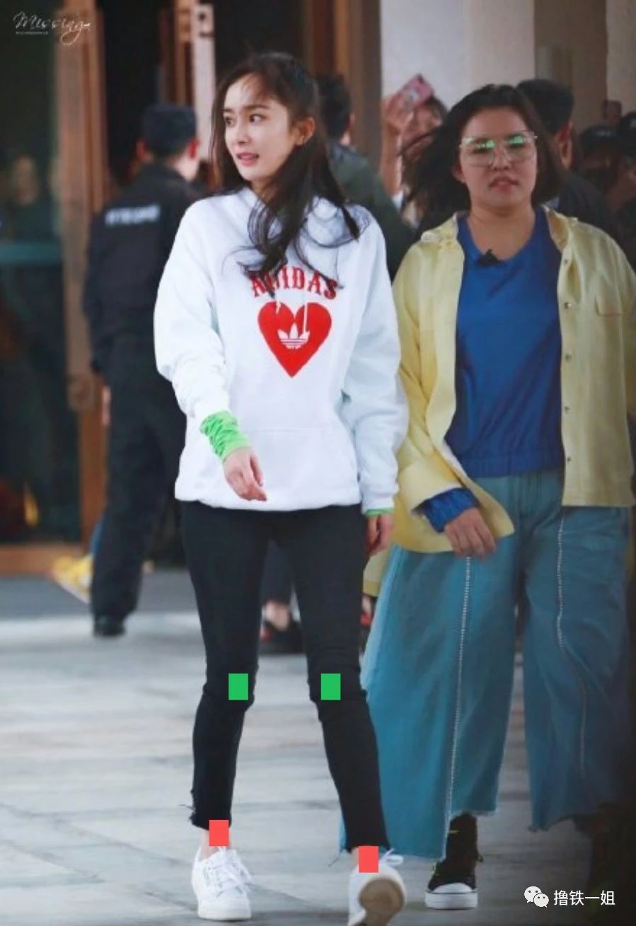 正常的体态,膝盖和脚踝都应该在一个平面内,杨幂的小腿歪成一个八字。