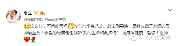 没想到消息一曝出,今天上午袁立就发微博回应:“这么快,不就昨天吗。你们北京真八卦。赵宝刚导演,是我这辈子永远的恩师加益友!”