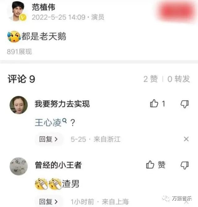 还别说,王心凌翻红后,范植伟就开始冒泡了,5月25日他在微博发了一条动态,仅仅五个字——都是老天鹅。这五个字虽然没有指名道姓评论别人,但网友们都看得出来,他是在暗讽《乘风破浪》的姐姐们。网友们看到后,纷纷留言吐槽:渣男。