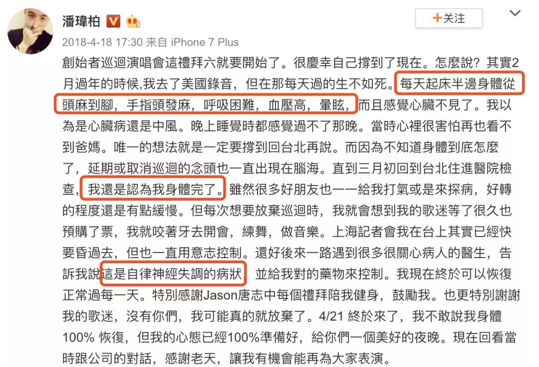 潘玮柏火了这么久,现在终于可以“过气”了 果酱音乐 港台男星 2019-11-23 20:27:39 949 创作不易,用心坚持,欢迎请BaGua喝几杯爱心咖啡!打赏并支持本文 打赏并删除本文 今年,潘玮柏39岁了。前两天他登上某个时尚杂志封面,照片里的他仍旧是27岁的相貌,意气风发,看起来好像不减当年。这些年对于潘玮柏来说,有心酸往事,亦有人情冷暖。不久后他的综艺《潮流合伙人》即将播出,潘玮柏要和合伙人们一起经营潮流集合店,说是要打造中国年轻人的潮流态度。说的好听点儿叫“斜杠青年”玩跨界,赶潮流,剥开外衣看就是,他似乎真的有隐退歌坛的打算。在80后和90后回忆里,潘玮柏占据着重要的一席之地,但随着青春时代但逝去,潘玮柏的辉煌时期似乎渐渐褪去。去年12月20日的记者会上,潘玮柏说:“不排除明年是最后一年,搞不好会突然宣布,我走了。”对于这个决定,果酱君和大多数歌迷们一样,选择庆幸和尊重。因为“过气”的潘玮柏,早该退圈了。出生于美国的潘玮柏,除了小时候在台湾呆过几年,几乎整个学生时代都在美国度过,后来才回到台湾。2000年,潘玮柏被刘德华对公司看上并成功签约,加入了著名音乐频道Channel V,成为一名电台频道的VJ。第二年,他参演了《麻辣鲜师》,这是一部近200集,放了三年之久的「台湾第一部偶像剧」,潘玮柏开始被大众熟知。作为当红炸子鸡,他紧接着推出专辑《壁虎漫步》杀入音乐圈,一炮而红。后面推出的两张专辑《我的麦克风》和《Wu Ha》,同样销量可观。他在音乐上的才华不容忽视,比如他在《快乐崇拜》所体现的律动绝对是一流。不论是重拍和还是在有限的歌词密度里做出的词量吞吐处理,都是最优解。也就是说,当时除了潘玮柏,基本上没人可以做到这个效果。但问题来了,《快乐崇拜》、《不得不爱》、《壁虎漫步》这些很火的歌曲,都是翻唱自国外曲目,所以原创能力不足的质疑声一直伴随着潘玮柏。于是从第四章专辑《高手》之后,潘玮柏开始自己包办词曲,开始大幅度自己写歌。同时他也拍了很多偶像剧,长相阳光的潘帅瞬间成为万千少女的心上人。那时候的潘帅真心很火。一年广告邀约13支,其中有三四条和当时同他齐名的周杰伦一起;百事请周杰伦蔡依林罗志祥代言,可口可乐就请他和姚明刘翔;反转地球个人演唱会,哪怕是在下雨天,北京八万人场上座率也高达95%;随便出个门,到处都是潘玮柏和他的歌。那是很神奇的一段时间,乐坛百花齐放:有周杰伦的七里香,飞儿乐团的我们的爱;有张韶涵的寓言,蔡依林的爱情三十六计;有林俊杰的江南,梁静茹的宁夏;还有SHE的波斯猫,王心凌的爱你......潘帅一度有和周董齐肩的趋势,各个媒体都在争论他俩究竟谁更胜一筹。| 2006年的问卷调查本以为他会像周杰伦和林俊杰那样,一直在这条路上火下去,可是什么时候开始,潘玮柏渐渐销声匿迹了呢?在他曝光率极低的这些年背后,又发生了什么事?或许,你根本想象不到。当时的潘玮柏并没有在歌手这条路上乘胜追击,而是扭头转向了影视偶像剧。08年和杨丞琳合作了《不良笑花》,收视率一度突破当年台湾偶像剧记录;11年,凭借电视剧《爱无限》,潘玮柏拿下金钟奖新一代视帝。本以为迎接他的是鲜花喝彩,谁想到是铺天盖地的攻击——「金钟奖“最衰视帝”」甚至有的媒体,称这个奖项为“排泄物”。在本该欢乐的庆功宴上,潘玮柏忍不住泪洒现场。可能正是从这个时候开始,他渐渐的力不从心。但是潘玮柏并没有放弃,他想要证明给所有人看,他不是只剩下一副空壳。早在2004年,潘玮柏在北京演唱《Wuha》时,因为跳起来后没有站稳,左腿韧拉断,当时就痛的跌倒在舞台上。但他还是咬牙站起来,继续唱跳完整整四首歌。演出结束,就赶忙跑到台湾植入了一条人工韧带,足足休息半年时间才能继续跳舞。2010年11月份,潘玮柏因为跳舞的时候用力不当,右膝的韧带和半月板断裂成两截,当时整个右腿肿胀,甚至需要抽血消肿才能穿得了裤子。「金视奖最衰影帝」事件后,潘玮柏变得更加拼命。2014年的“伊甸园”演唱会前,潘玮柏为了排练一个高空特技,体力透支从台北小巨蛋3层楼高的空中坠落,脑袋和地面发生碰撞,当场大出血。他昏迷了很久,缝了几十针,额头上留下了一道17公分的瘆人伤口,这次意外让潘玮柏差点就把命交代在那里。不容易好起来了,却又偏偏祸不单行。先是忽然患上了严重的肺炎,在去年身体又突然出现了毛病。身在国外的他潘玮柏无助的和大家老实交代:| 每天起床半边身体从头麻到脚,呼吸困难,血压高,晕眩出道18年,除了左右腿韧带断裂,高空坠落,还经历了肺炎、自律神经失调。他每一次演出,都是在拼命。至此,潘帅开始慢慢的沉寂。前年,在娱乐圈消失了整整三年的潘玮柏突然宣布签约华纳唱片。不仅如此,他还带着新歌、新作品、新综艺回归。但是大多数人都隐隐约约觉得潘玮柏的人气大不如前,认为节目里存在感甚微。有人说他在音乐方面再努力,都逐步走向下坡;有人说他参加各种综艺节目,看起来都像是“过气的走穴艺人”。......但他真的过气了吗?实力也跟着江河日下了吗?没有。在年初《新说唱》的一期节目里,潘玮柏照常戴着墨镜、穿着肥大裤子、嘻哈范十足,和邓紫棋表演《死了都要爱》。没想到发生了开头忘词的演出事故,潘玮柏靠着临场反应,将中断唱歌的沉默时间,也变成表演的一部分,让观众