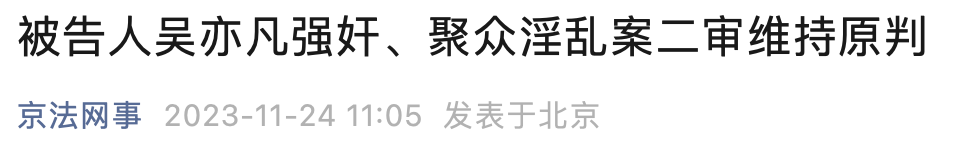 据京法网事:2023年11月24日上午,北京市第三中级人民法院依法对吴亦凡强奸、聚众淫乱上诉一案公开宣判,裁定驳回上诉,维持原判。