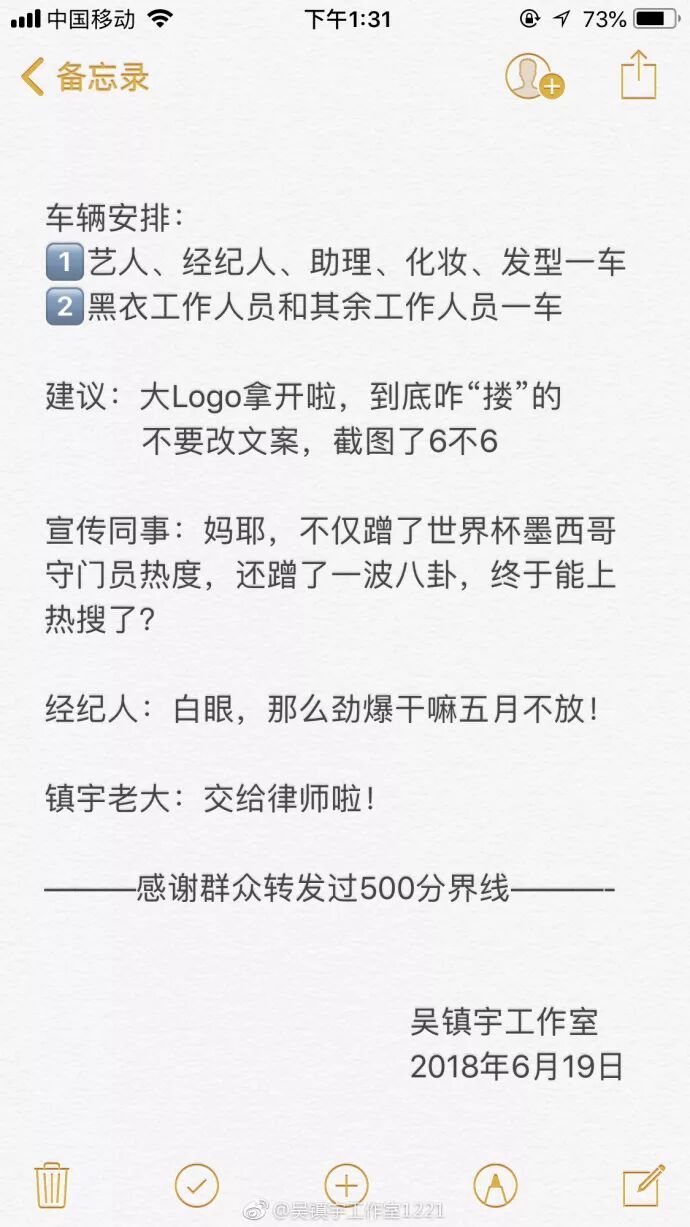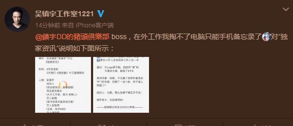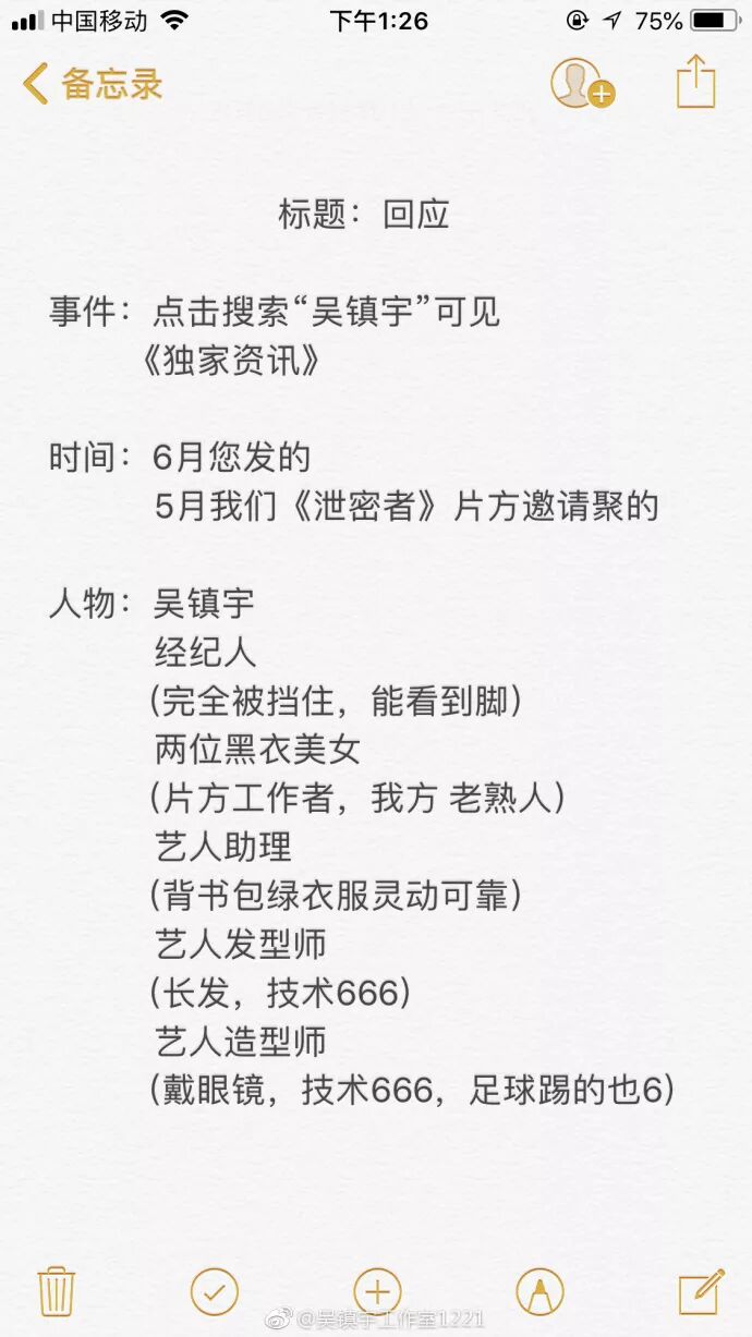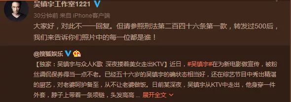 很快吴镇宇工作室也在微博发布声明,称:“大家好,对此不一一回复。但请参照刑法第二百四十六条第一款” ,经查询,这正是关于“捏造事实诽谤他人”的法条。吴镇宇工作室还表示,“转发过500后,我们来告诉你们照片中的每一位都是谁!”最后这一下也是非常皮了。不过这样的心态显然是底气十足不怕流言。