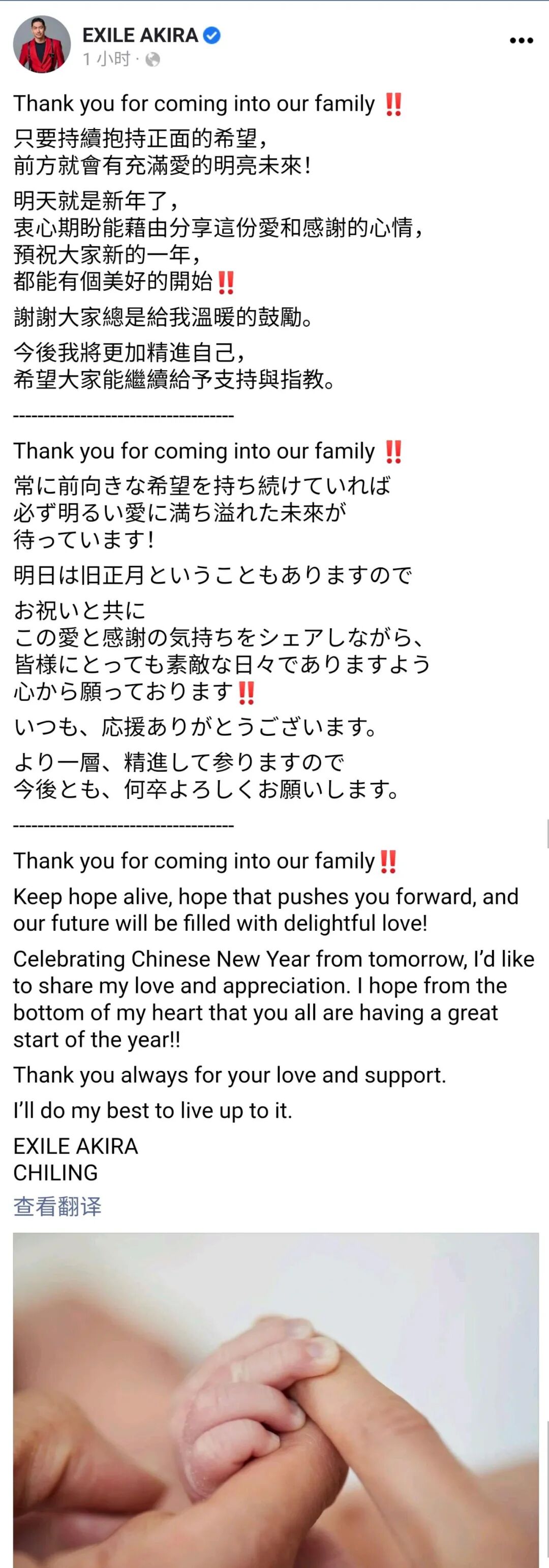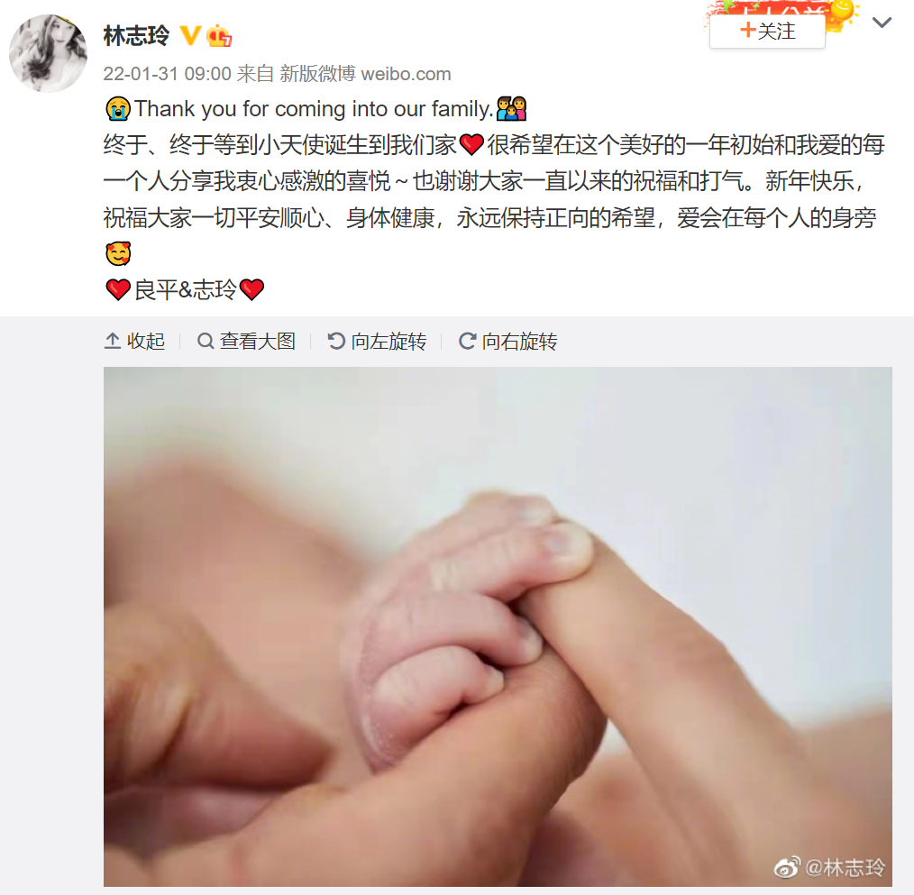 林志玲,生了 环球时报 内地女星 2022-01-31 13:10:31 55 创作不易,用心坚持,欢迎请BaGua喝几杯爱心咖啡!打赏并支持本文 打赏并删除本文 今早(1月31日)9点,林志玲发布微博宣布生娃!她连用两个“终于”写道:?Thank you for coming into our family (谢谢你来到我们的家).???终于、终于等到小天使诞生到我们家❤️很希望在这个美好的一年初始和我爱的每一个人分享我衷心感激的喜悦~也谢谢大家一直以来的祝福和打气。新年快乐,祝福大家一切平安顺心、身体健康,永远保持正向的希望,爱会在每个人的身旁?林志玲的丈夫黑泽良平也在社交媒体发文。2019年6月6日,45岁的林志玲与37岁日本放浪兄弟成员黑泽良平(AKIRA)宣布结婚。来源:南方都市报了解《环球时报》的三观请长按下方二维码关注我们or回到文章顶部,点击环球时报 (微信公众号ID:hqsbwx) 创作不易,用心坚持,欢迎请BaGua喝几杯爱心咖啡!打赏并支持本文 打赏并删除本文 感谢您的支持鼓励,我会继续努力的!文章地址:用户邮箱:打赏金额:USDT 请输入数字点击”去打赏“,即可进行打赏支持本文章哦 林志玲 发表评论