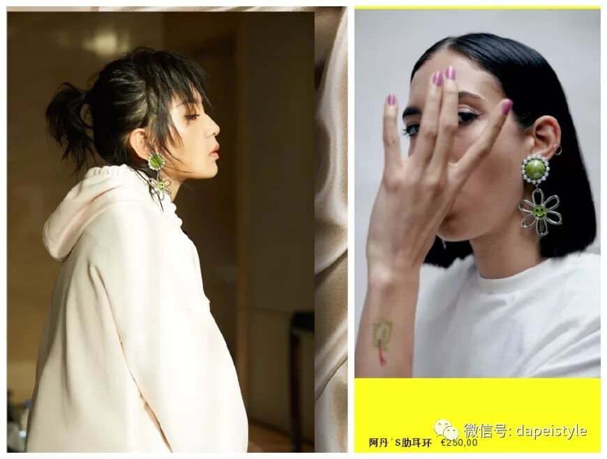 同样是来自safsafu 看看模特的就知道这造型有多夸张了!还是带点土味儿的珍珠、绿色和花朵的组合,没想到带起来还有意外之喜!这种夸张设计还是显脸小的神器哦!不得不说周笔畅带起这种要更合适!