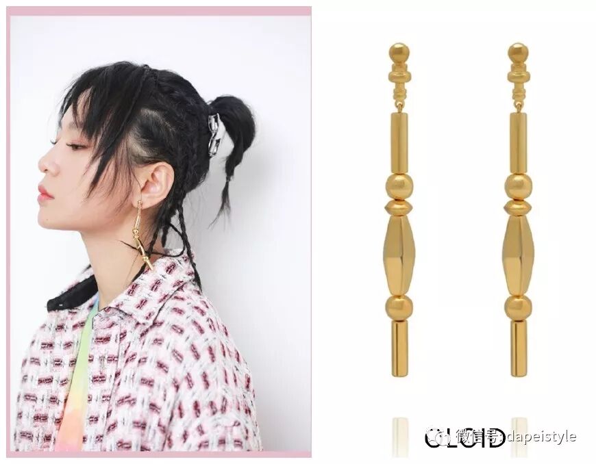 来自safafu 的不对称设计。红色和金色这种很难驾驭的颜色,一边是流苏状,一边是简单的圆球,红色部分倒是还有了几分少女感!只是被周笔畅冲淡了不少!