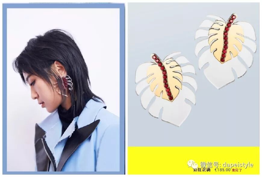 如果上一个还不算夸张那这个是不是够大够夸张了!但胜在款式并不复杂才能带出一种别样的感觉!要搭配一身西装让本身就中性的周笔畅更具帅气,耳环是树叶形状,虽然达到跨装与整体风格倒也算配合!只选择带单边也是能尽情整体的重感哦~