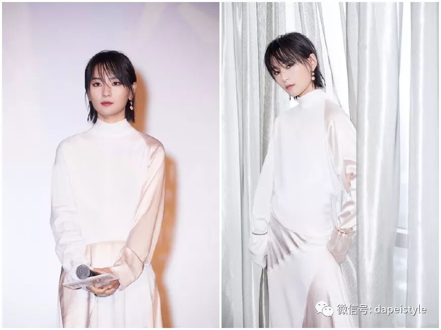 出席活动时一身白衣,让整个人看起来淑女了不少,亮面的材质有一种下垂感,搭配了一对白色的渐变圆环耳环,还任性的只带了一直,走了一次单边时尚!将头发都别到耳后让整个人瞬间硬起来不少!