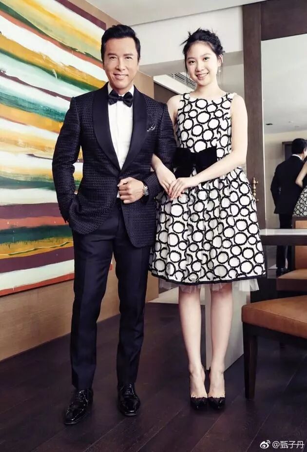 照片中甄子丹和女儿甄济如同框合照。甄子丹一身西装风度翩翩,甄济如穿着小礼裙踩着高跟鞋,看起来竟与爸爸一边高,文静乖巧。