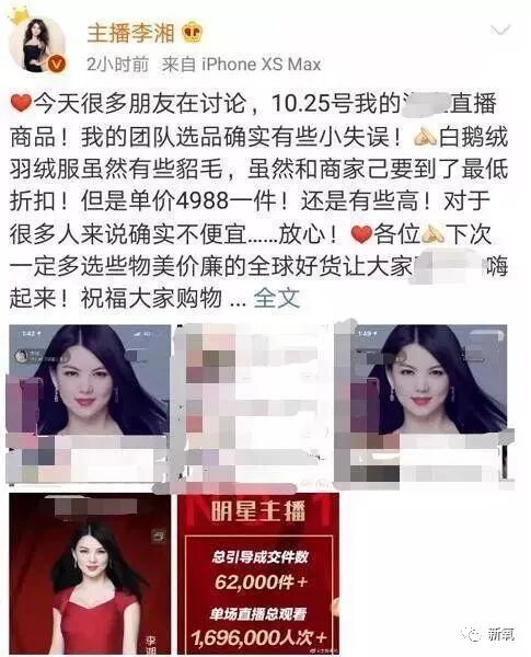 还没等商家喘过气来,李湘又公开回应称“选品错误,确实不便宜...下次会选物美价廉的好货分享大家”。