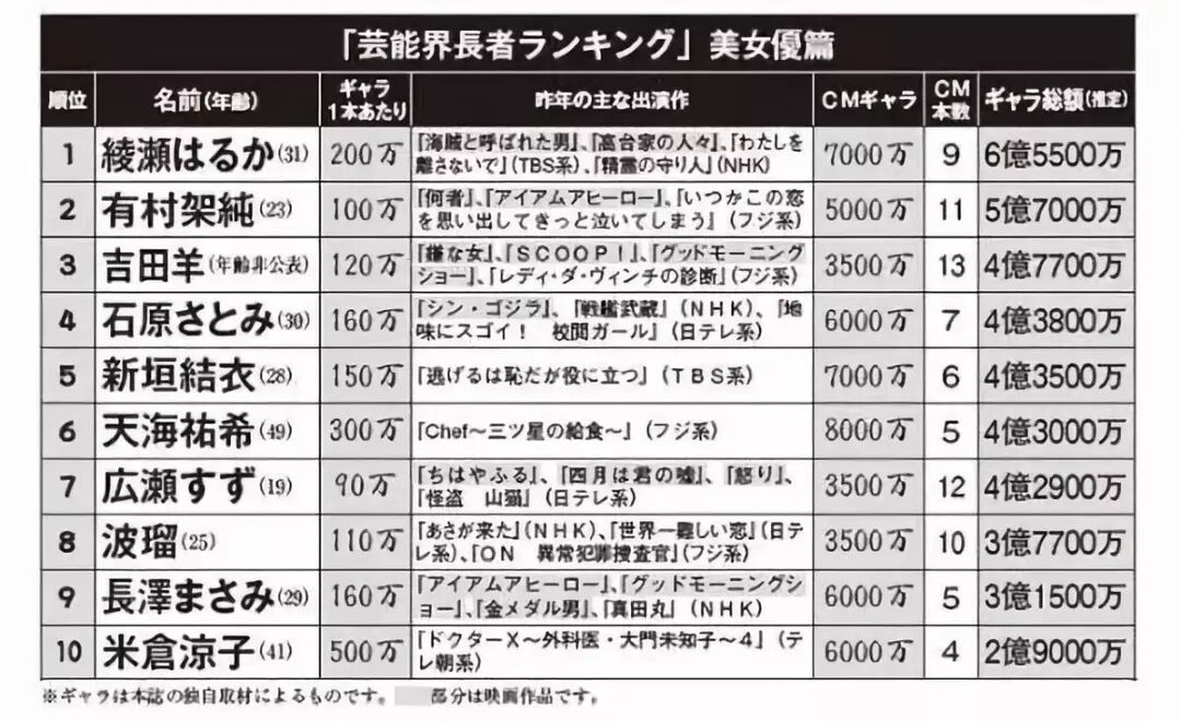 此前日本杂志发布了两组艺人片酬排行,女优方面绫濑遥毫无悬念是最多的。但即使是日本女演员中年收入最高的绫濑遥,也只有6亿5500万日元。