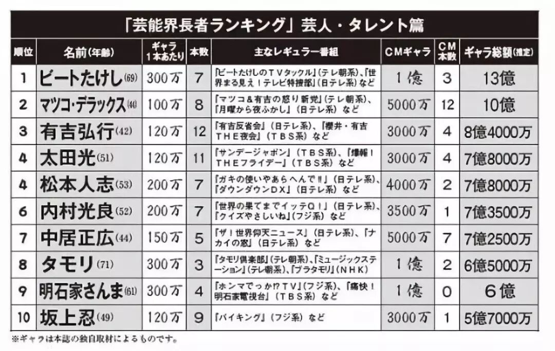 如果不局限于演员,搞笑艺人的收入会高一点。在男艺人收入榜单上,第一位的是大御所的搞笑艺人,也是著名的电影导演,实实在在的日本演艺圈大物北野武 ,去年年收入13亿日元,单集电视剧演出费报价300万日元,单集电视广告演出费报价1亿日元。接着是红出旬圈的松子・DELUXE 的10亿日元。