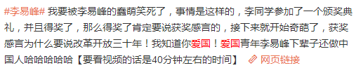 李易峰爆红之后,不少网友扒出了李易峰以前的微博、博客、采访等。不仅没有黑历史,反而还是个正能量的爱国青年,更有网友说道:“李易峰真是一个连获奖感言都会说改革开放三十年的好孩子啊。”