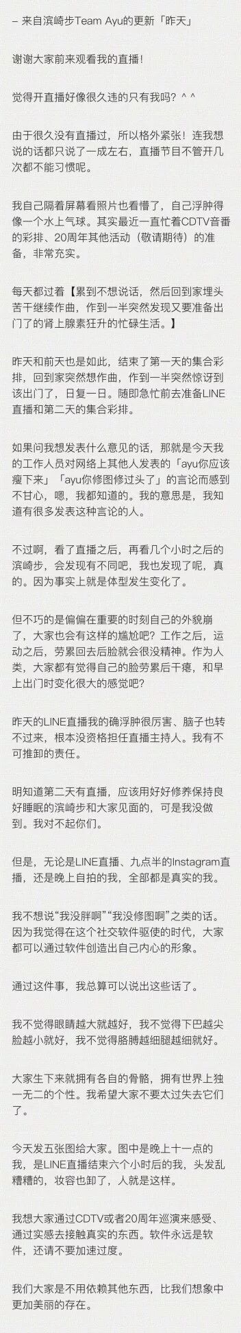 ▲随后,滨崎步就此事发长文向粉丝道歉:“看自己浮肿的像一个水上气球,因为工作太繁忙了,累到没时间好好休息,所以直播时的状态看起来非常差,紧张到不会说话了。会好好休息调整状态,向大家致歉对不起。”