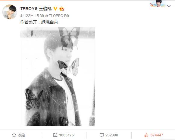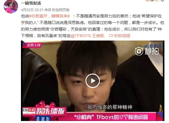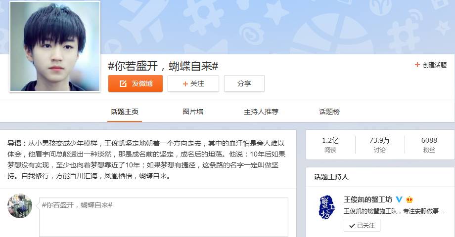 话题#你若盛开,蝴蝶自来#出自王俊凯4月22日发布的一条博文,截止目前阅读量已过1.2亿,讨论量74.3万,备受关注。在微博中王俊凯粉丝纷纷带此话题发博感叹,当初小小少年如今已经盛开成大人模样。