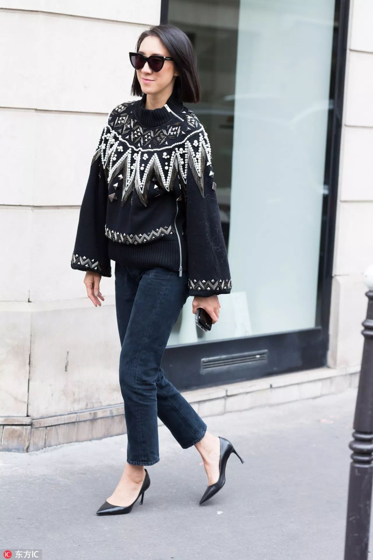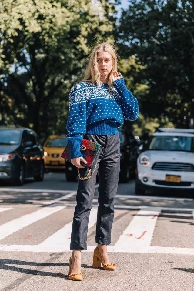 在日常穿搭中,一件提花毛衣已经自带亮点,下半身的搭配选择简单的牛仔裤足矣。
