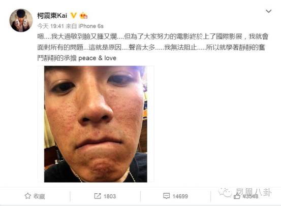 昨天晚上7点,柯震东发微博解释自己皮肤的原因,是因为严重的过敏导致的,整个脸又肿又烂,但为了在威尼斯电影节为团队站台,还是不得不面对大众…