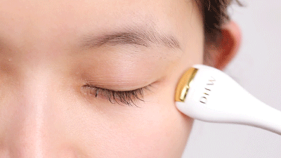 Step 4:搭配德玛莉按摩小金棒,在眉毛上方、眼睛上下部分从里向外滑动滚轮,直至眼霜完全吸收。