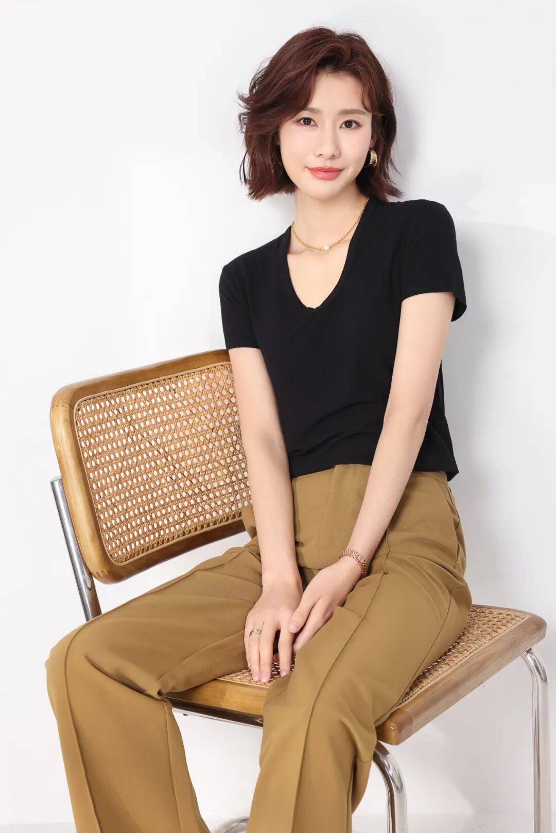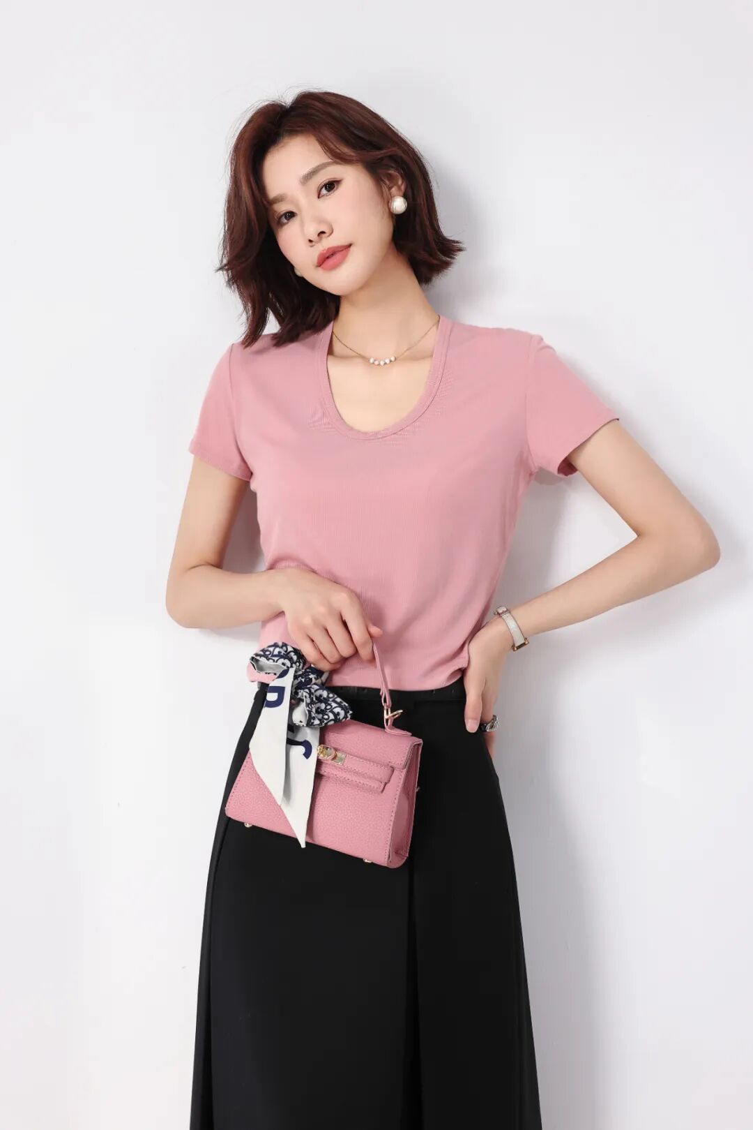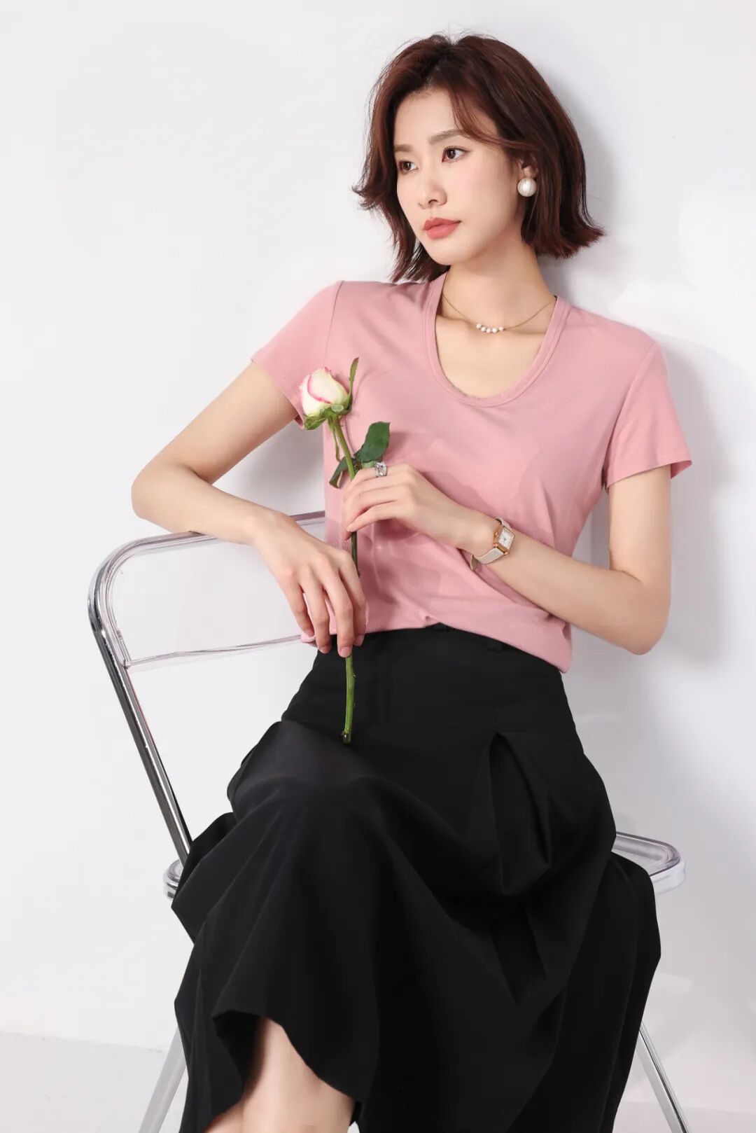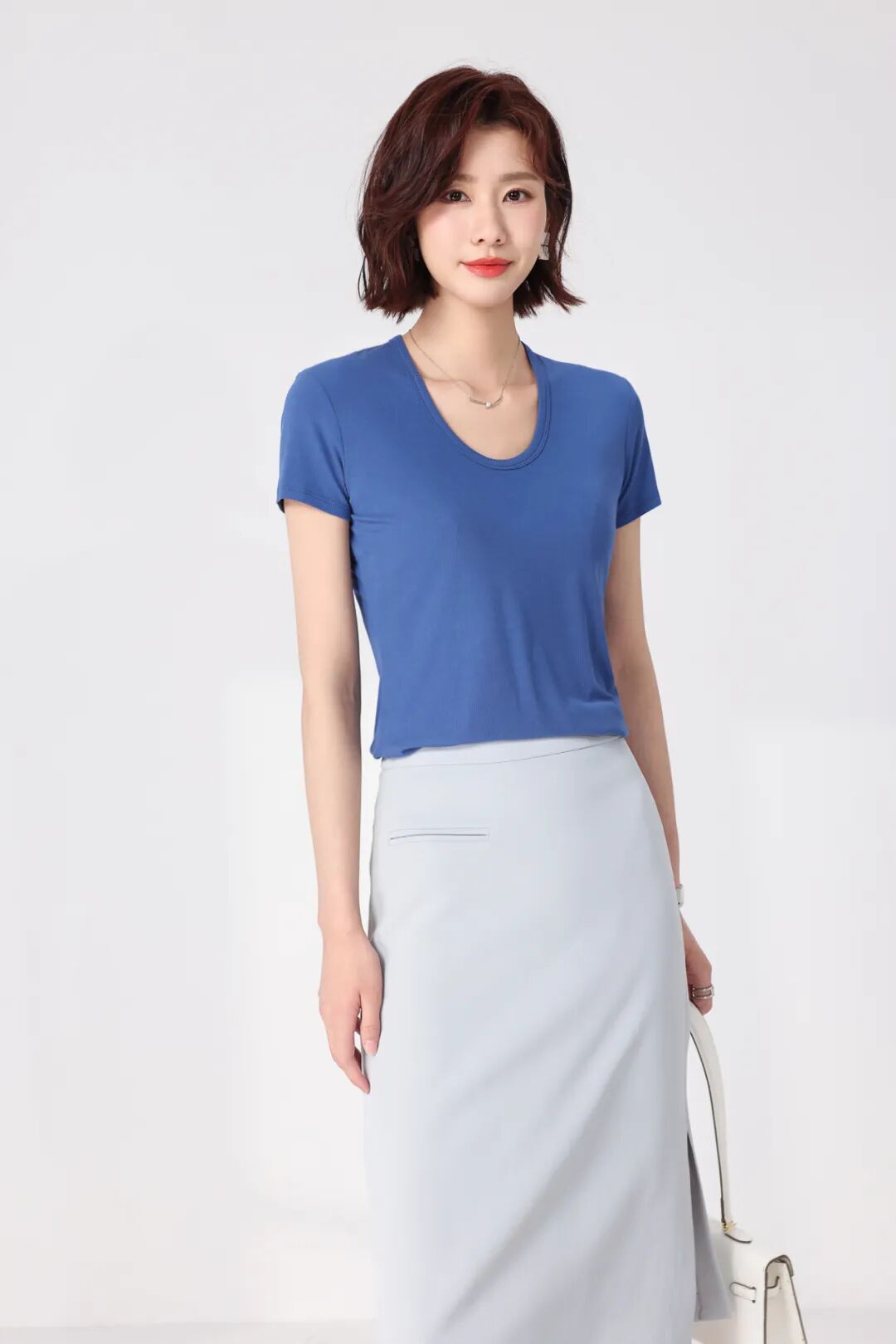 比起圆领,它露出更多锁骨和颈部,视觉上延伸脖子长度,尤其适合短脖、圆脸、方脸姐妹。