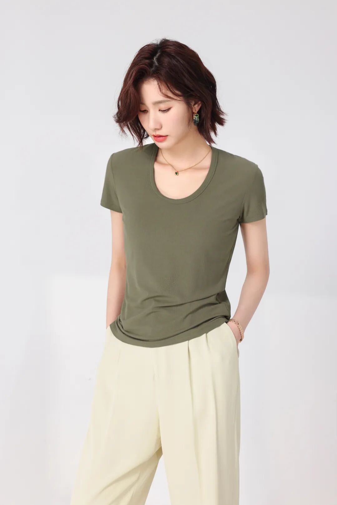 市面上这类深U领T恤挺多可选的,款式看着大差不差,可一摸材质,大相庭径,夏天上身一穿一个闷。