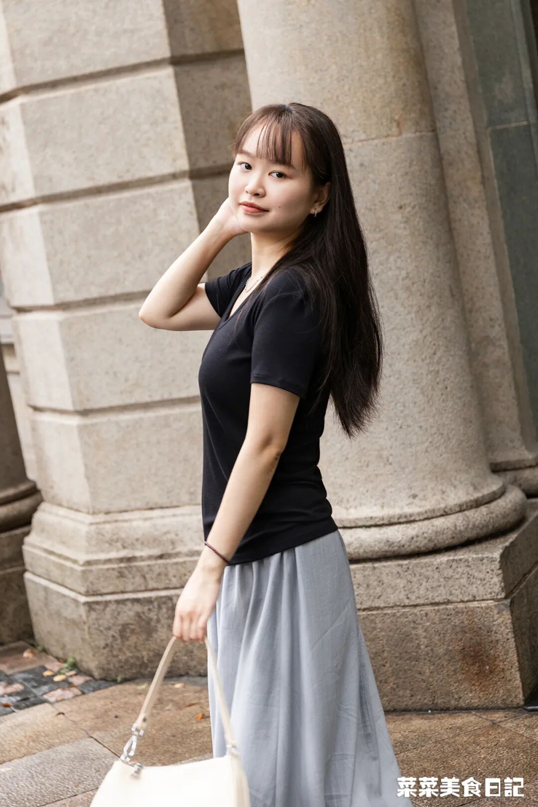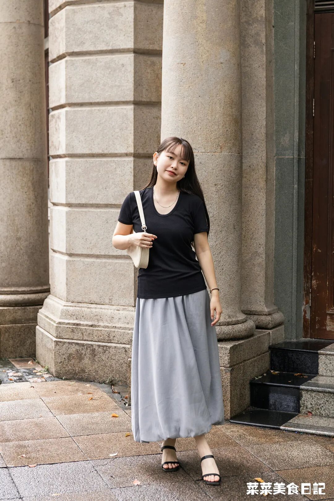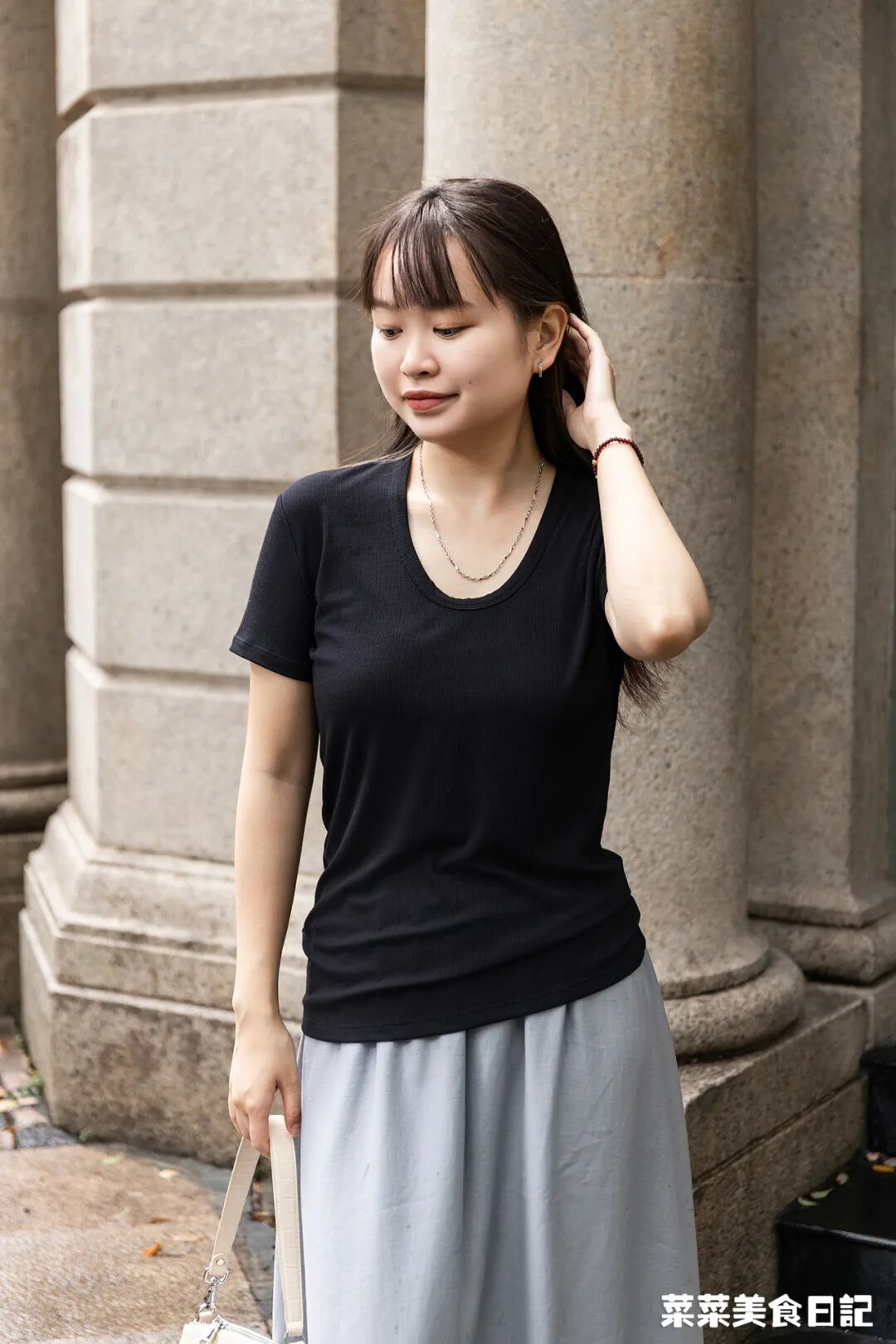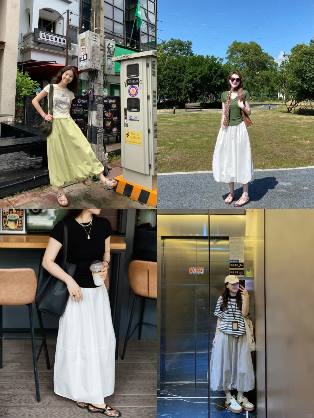 也不妨挑个T恤,跟裙子搭一套,比如黄T/绿T+白裙,粉T+灰裙,黑T+灰裙,都是很经典的搭配色系呢~