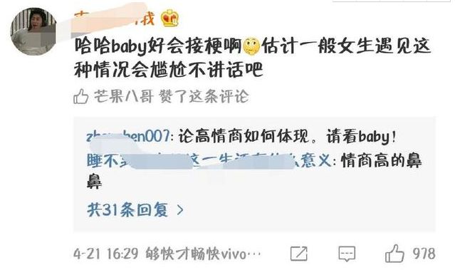 如此自嘲不亏综艺女王的称号,观众看到Baby漂亮的回应,不禁赞叹Baby的情商真的好高。