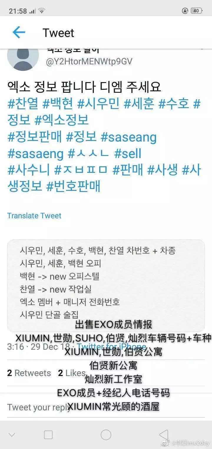 最近又有人在网上卖EXO的消息了,,除了EXO成员们与经纪人的电话号码、经常光顾的居酒屋,还有Xiumin、世勋、SUHO、伯贤与灿烈的车牌号码与车种,还有Xiumin、世勋、伯贤的住所,包含伯贤新公寓、灿烈新的工作室!