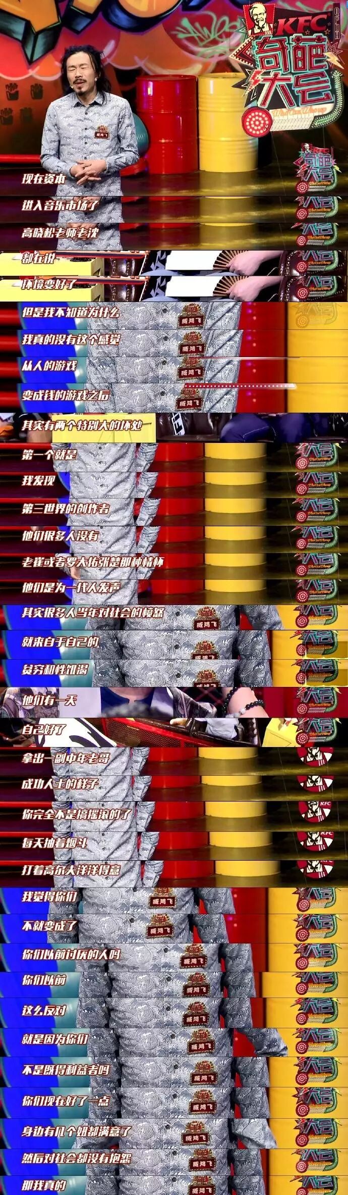 吐槽是飞飞的主要画风。在《奇葩大会》上他说说自己,“冬天的时候在《我是歌手》弹键盘,夏天的时候在《超级女声》当评委。”