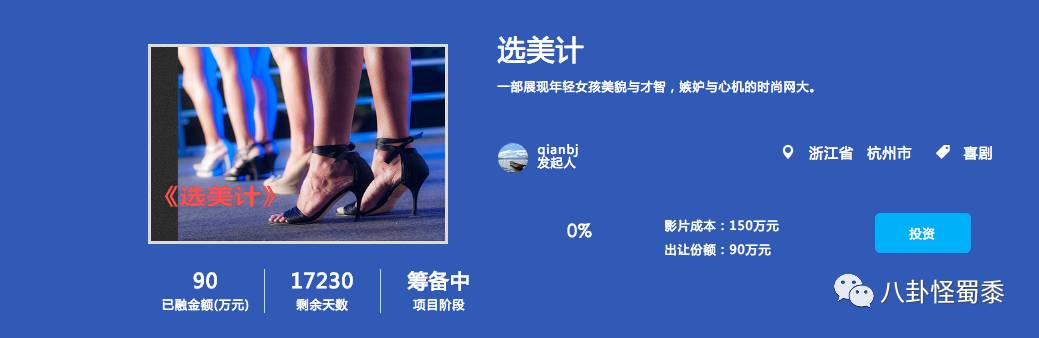 其中作为投资方之一积幕,其实根本就是一个互联网众筹平台,而这部《选美计》也上线了众筹项目,一共150万,现在已经筹集到了90万。