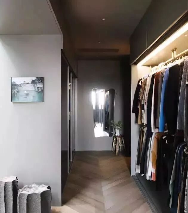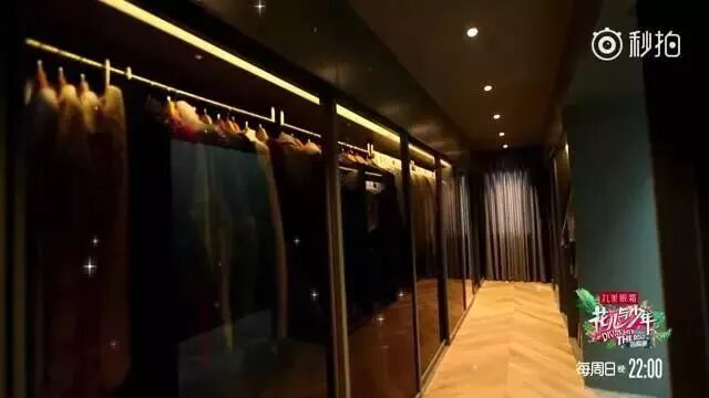 作为男明星的井宝,衣帽间当然是十分的亮眼。浅棕色的衣柜搭配白色的氛围灯,彰显出不同的时尚感,当然,衣服多也是亮点。