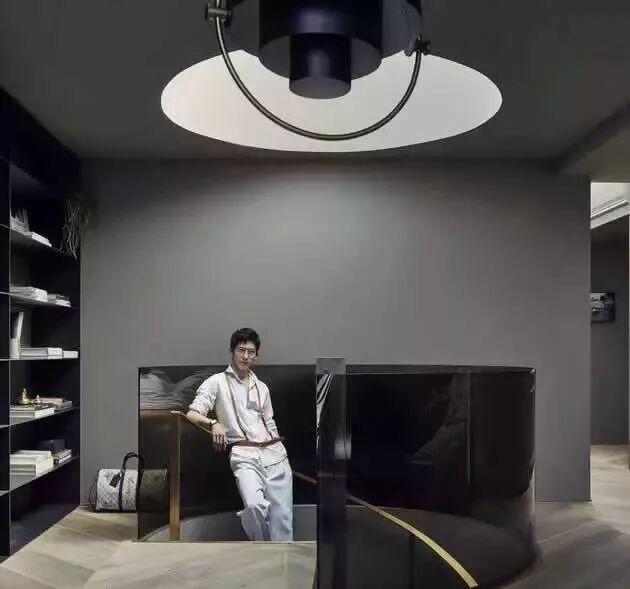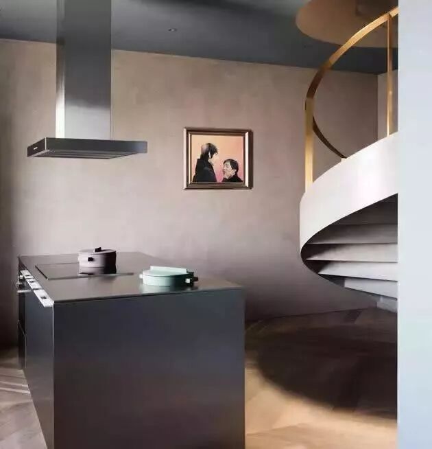 井宝家的楼梯也是他自己设计的,简单大气的水泥旋转楼梯,扶手是精致的金属色,尽显低调的奢华。