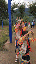 吕燕老师和穿有拉祜族民族服装的孩子们一起围成一圈,翩翩起舞