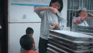 在午饭时间,吕燕姐姐又变身成了打饭老师。她说,孩子们要吃饱了才能身体壮,学习好。