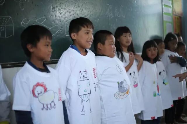 下午到啦,三大箱教具也终于露出了“庐山真面目”——全是一盒一盒五颜六色的画笔,吕燕姐姐摇身一变,化身美术吕老师。吕老师让孩子们在印有“喜欢支教”的白T-shirt上尽情绘画,她相信孩子们无限的想象力就是最好的创作来源。