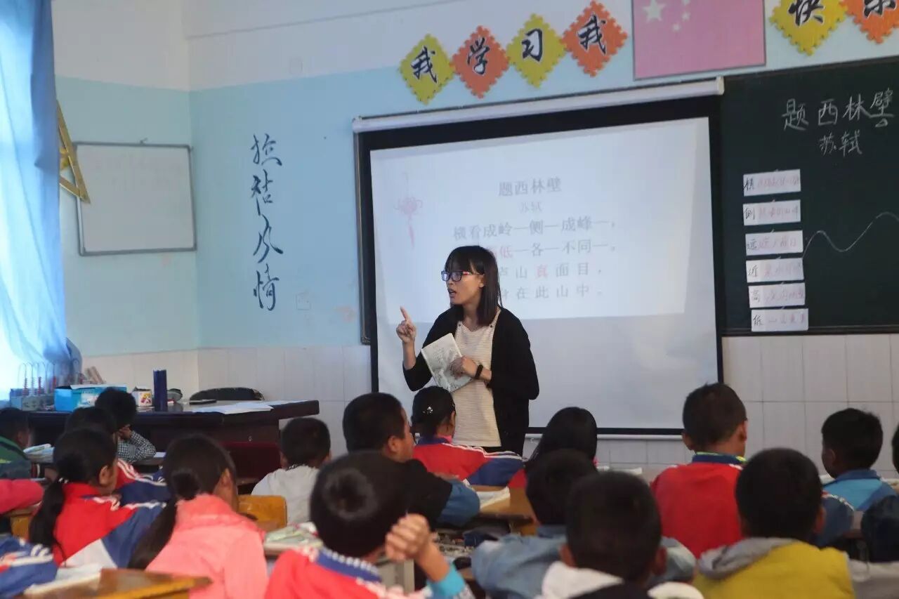 抵达项目学校后,吕燕坐在教室后面,和孩子们一起,跟随美丽中国2016-2018届支教项目老师李佩英,大声朗读起苏东坡的诗《题西林壁》,“横看成岭侧成峰,远近高低各不同,不识庐山真面目,只缘身在此山中”。