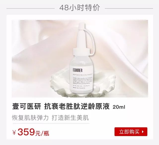 说到抗皱抗衰老,就不得不提胜肽了,壹可医研的这瓶胜肽逆龄原液,结合了棕榈酰五肽-3、棕榈酰五肽-4、棕榈酰五肽-5三款高浓度微分子胜肽,针对肌肤静态纹、表情纹,可以促进胶原蛋白、弹力纤维和透明质酸增生,并抑制造成胶原蛋白退化的酵素,维持肌肤的完整结构。