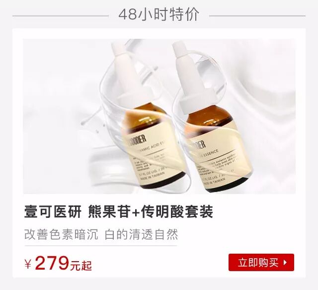 美白是护肤过程中必不可少的,除了日常的防晒以外,还要配合使用一些美白产品。前面说到壹可医研原液都是核心原液,所以它的美白原液也分白天和夜晚使用,“传明酸原液”和“熊果苷原液”就是它家美白产品中的“黑白双煞”。