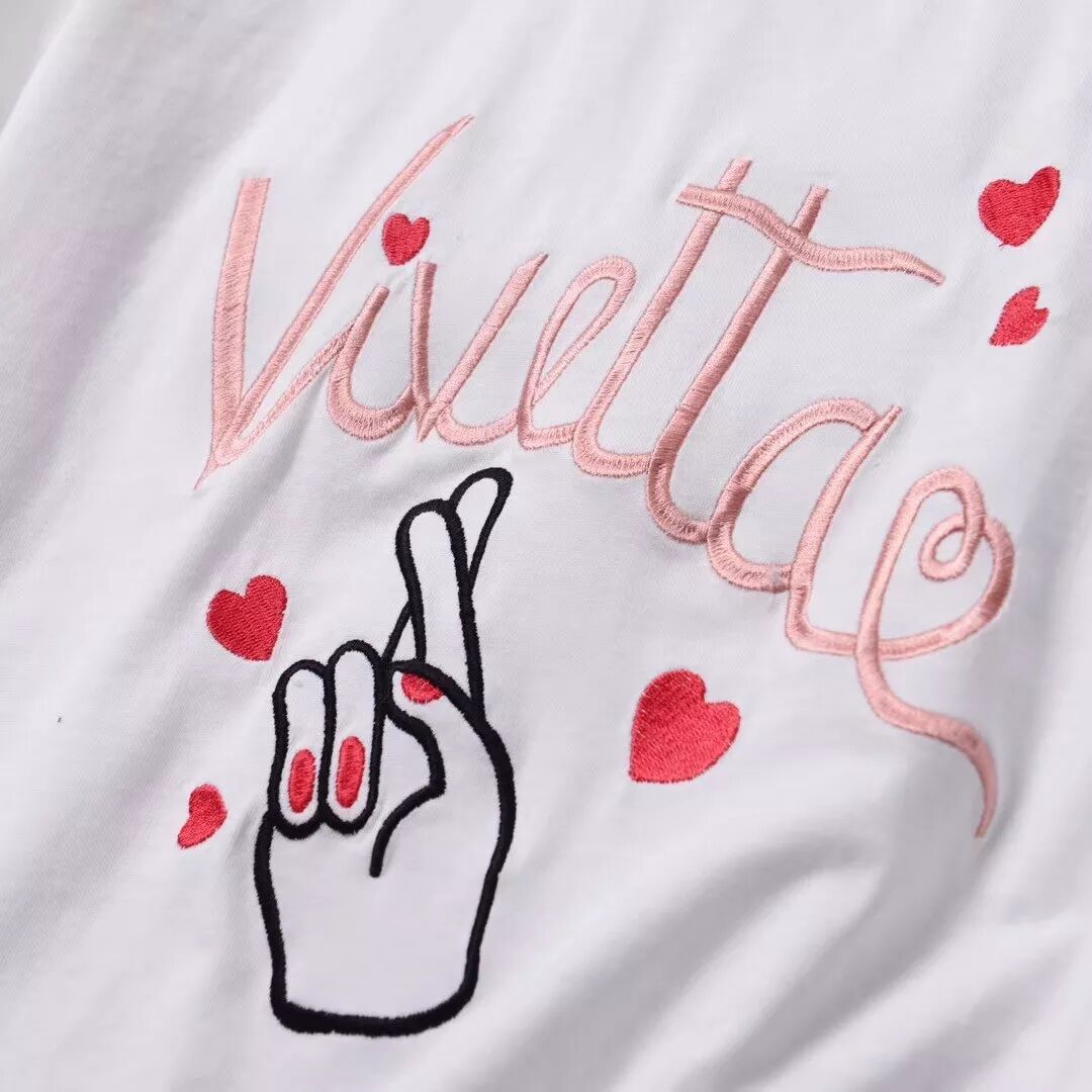Vivetta的少女气息真的给了我眼前一亮的感觉,相信每个女孩子都会跟我一样沦陷在这片“田园地”。今天带给大家的这款T在工艺上面采用了立体定位刺绣,粉色的刺绣图相应在白底的纯棉面料上,让整件衣服达到了减龄的效果。比心的经典动作更加体现了作为一个萌妹子们的标配,所以穿上这么一件有个性的T,再加上你有一颗萌萌哒的心,绝对是不容错过的一款衣服。