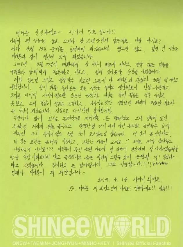 15日,SHINee崔珉豪将在庆北浦项乌川邑海军陆战队教育训练团入伍。珉豪公开了剃发照以及亲笔信,他在信中感谢粉丝,并表示为了不让大家失望,给大家带来积极向上的能量,将更加努力地度过军队生活。