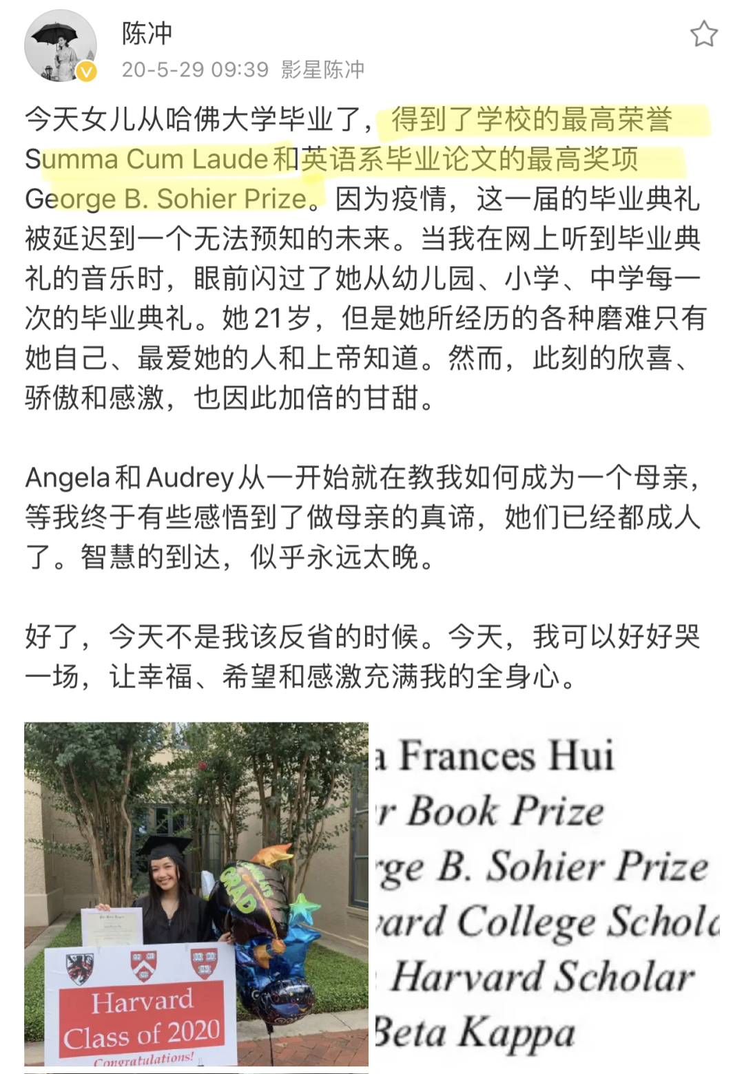 还记得影后陈冲吗?两个女儿都毕业于世界顶级名校? 橘子娱乐 内地女星 2024-03-04 19:05:43 340 创作不易,用心坚持,欢迎请BaGua喝几杯爱心咖啡!打赏并支持本文 打赏并删除本文 编辑:郑关尔聊起娱乐圈出身不凡的女明星大家会想起谁?橘提名陈冲⬇️她出生于医学世家,爷爷是叶挺独立团的军医,参加过南昌起义;大爷爷(爷爷的哥哥)是著名的微生物学家、中科院院士;外公是我国药理学奠基人,曾于哈佛大学进修;外婆是知名的社会学家;父亲是知名医院的终生教授、院长、博导;陈冲选择了演戏,如今看来她在这个领域也算是颇有成就。1980年,她凭借电影《小花》,成了第三届百花奖的视后⬇️当年出演这部电影的除了陈冲,还有唐国强和刘晓庆两位老戏骨,时隔43年后的2023,三位又同台了⬇️这之后陈冲一直在美国发展,1988年,她和尊龙一起主演的电影《末代皇帝》,获得了奥斯卡最佳影片奖⬇️当年的尊龙和陈冲被大家称为「才子佳人」,(分别饰演溥仪和其妻子婉容)二人在奥斯卡现场为其他作品颁奖时,开起玩笑来的陈冲相当俏皮⬇️(现在都是大姐大即视感啦!)几年后,她又凭借《红玫瑰与白玫瑰》获封金马奖最佳女主角,之后,不论执导还是出演,她的电影都获得了不俗的成绩⬇️2014年,她受邀成为金马奖评委会主席,(担任过这个职务的还有巩皇、名导李安、杜琪峰等。)此外,她还是奥斯卡金像奖评委⬇️陈冲在影视界的地位可见一斑,而她的第一任丈夫柳青,也是影视圈中人,1984年二人在美国结婚,但四年后,他们就因为观念不合分开了。聊起这段过往,陈冲将其形容为「不舒服、不相配的婚姻」⬇️和前夫离婚两年后,她和如今的丈夫彼得结婚,彼得是心脏科医生,在旧金山工作。二人相识于好友介绍,算是一见钟情,彼得是陈冲好友的老板,看着家境应该不差。婚后陈冲有过一次流产,因此被医生告知难以再怀孕,于是她决定收养孩子。1998年,夫妻俩在南宁收养了一对双胞胎。一开始,陈冲对她们非常好,把她们接到美国抚养⬇️但到了2002年,她有了两个亲生女儿,大女儿许文婷,小女儿许文珊⬇️(坊间一直有双胞胎冲喜一说…)最后,陈冲决定将双胞胎「转让」,并言明对四个女儿一视同仁,只是自己精力实在有限,才做此决定。这事儿在当年闹得沸沸扬扬,还惊动了有关部门,但陈冲方表示这并非弃养而是转让,且被转让后双胞胎生活得非常好,还言明根本不存在「领养」一说。个中矛盾如今已经难以明了,橘只想说:物质条件的优渥弥补不了孩子们心理上的落差,希望双胞胎真的如她所言,过得不错。如今,陈冲的两个亲生女儿成长得非常好。大女儿许文婷Angela,2020年以最高荣誉从哈佛大学毕业,成绩相当好。日常看着是个爱笑、自信的姑娘⬇️小女儿许文珊Audrey,今年22岁,毕业于纽约大学,姐妹俩关系非常好,Angela经常给妹妹拍照,Audrey作为姐姐的「专属模特」,表现不错。叛逆少女即视感的、女特工feel、古灵精怪的、比较丧的风格…她还在《误杀》里饰演过郝蕾&肖央的女儿,和亲妈同台飙戏。此外,她还和孙阳合作过《游水》,孙阳大家伙儿还有印象不?就是《孤注一掷》里的阿才,二人关系不错,在ins上有过互动⬇️节目上,大张伟、刘宇宁等还为Audrey即兴创作过一首歌⬇️她还和妈妈一起出席过珠宝活动、拍杂志,单人照表现力也不错。如今Audrey在美国致力于参加有关人权的活动,为女性护工争取更高的报酬⬇️还会在国外的剧场演出,看着和同事们相处融洽。(第一排右)(左二)日常会做菜、和妈妈去滑雪,生活非常丰富。祝好。最后一句希望四个姑娘都好好生活。※ 最近公众号又又改版啦,橘子君发布的文章可能会被淹没在推送页面的大海里…※ 麻烦宝子们动动手点一下设为星标,不要错过你的橘呀!!滑动查看点击「橘子娱乐」公众号头像→点击右上角...符号→选择第一个“设为星标”2024年 HAVE A GOOD TIME JUZI ?YULE离爱豆更近��步 扫!部分图片来源于网络,版权归原作者所有。如涉及侵权或对版权有所疑问,请邮件联系[email protected]。我们会尽快处理,感谢。 为你的爱豆,点个好看 创作不易,用心坚持,欢迎请BaGua喝几杯爱心咖啡!打赏并支持本文 打赏并删除本文 感谢您的支持鼓励,我会继续努力的!文章地址:用户邮箱:打赏金额:USDT 请输入数字点击”去打赏“,即可进行打赏支持本文章哦 陈冲 发表评论