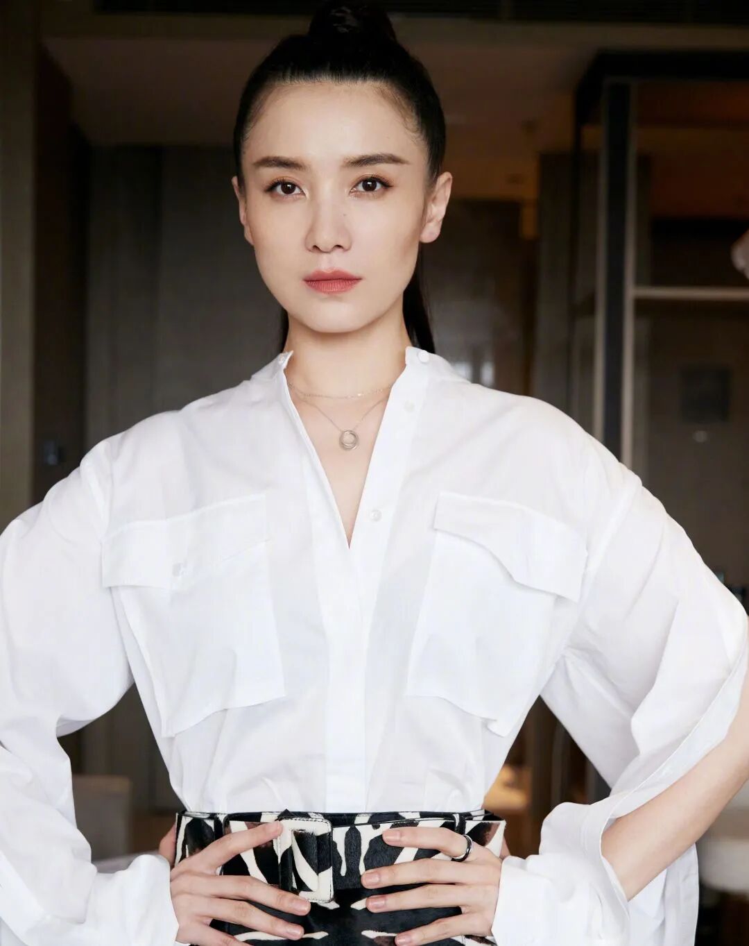 白色的衬衫里面叠穿一件浅色打底,没有珠光宝气的装饰,也一样很美。