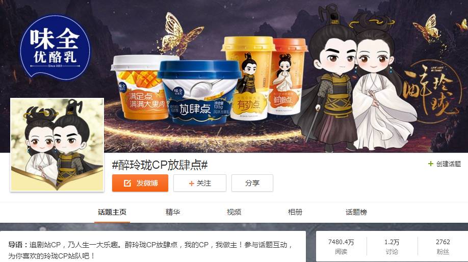 当《醉玲珑》在互联网讨论量达到一定热度时,味全优酪乳在微博发布#醉玲珑CP放肆点#话题活动,“站CP”已经成为了时下年轻人,特别是消费优酪乳产品的主力军——年轻女性,配合观剧的必要行动。味全优酪乳适时的投其所好,以粉丝喜闻乐见的形式,鼓励粉丝晒产品,站CP。在促进线下销量的同时,收获了近7500万阅读量,1.2万讨论量。