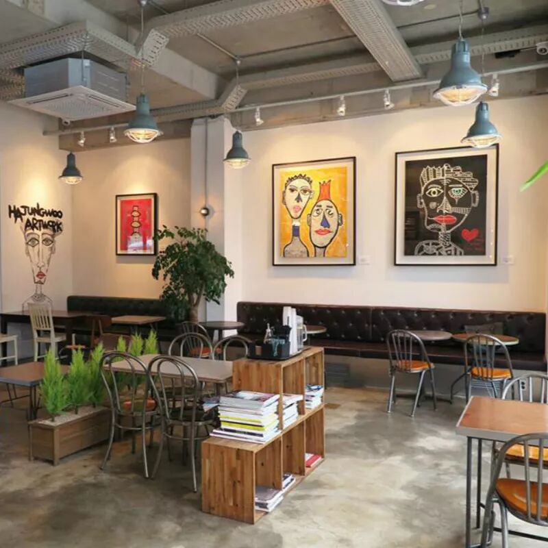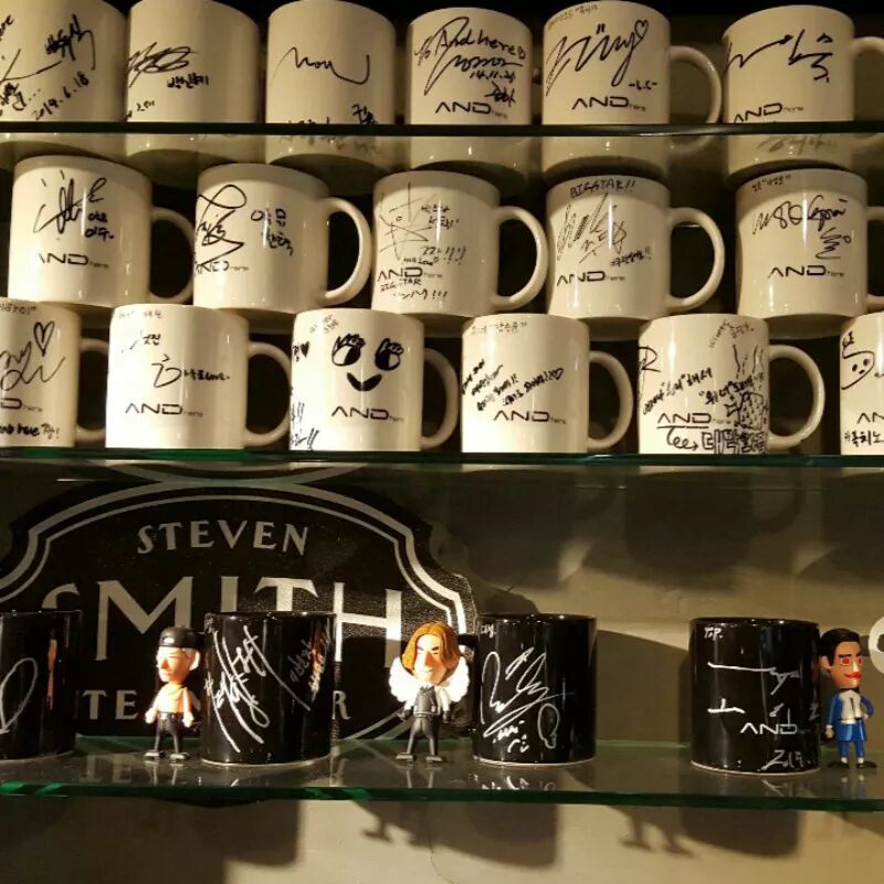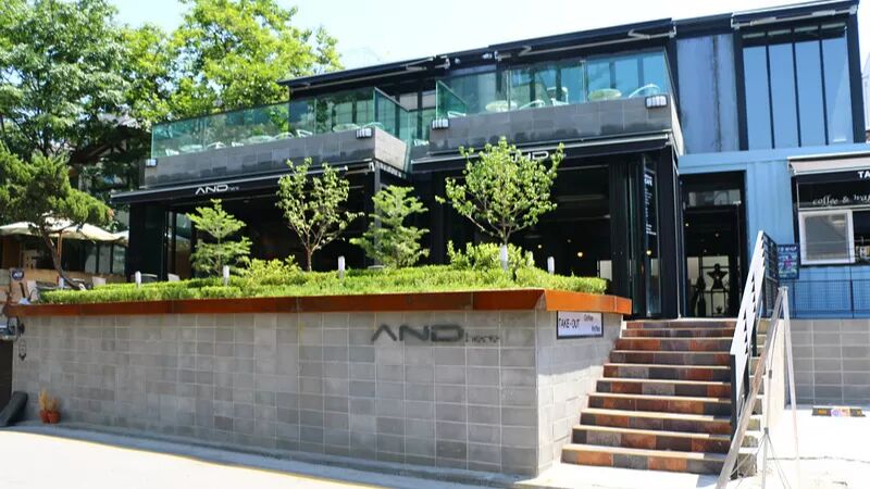 AND. Here Cafe的老板是BigBang的另一位成员Seungri。入口右边的货柜为开放式厨房,装潢带点轻工业的水泥风,外墙的颜色偶尔改变,为粉丝带来新鲜感。其中,Top送给Seungri的大猩猩,也是值得拍照留念的场景。