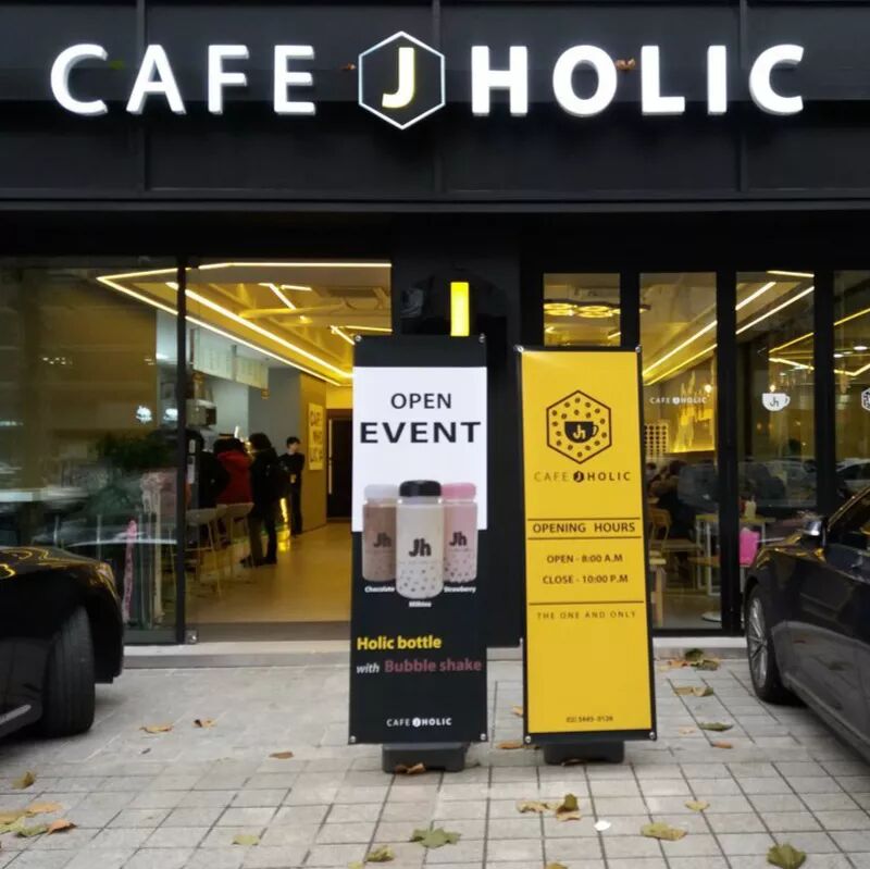 金在中撤资了上一家咖啡馆Coffee Cojjee后,随即于2013年的圣诞节期间在明洞开了这一间Cafe J Holic,吸引众多粉丝的目光。咖啡馆是4层楼的格局,各种美味的饮品及甜品当然不可或缺,排列整齐的周边商品也等着你把它们带回家,热销的单品还经常缺货。
