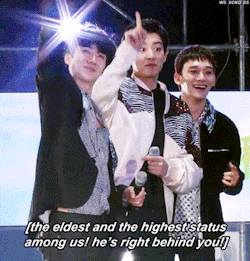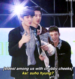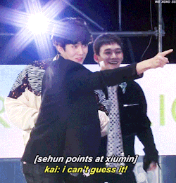 在之前自然乐园举办的粉丝见面会中,世勋和KAI同组进行“你演我猜”的游戏,当出题板给到“XIUMIN”的题目时,世勋先是着急的指了上面,然后又站在KAI身后的XIUMIN,就在KAI一头雾水的时候,平常拒绝撒娇营业的忙内贡献了掬小肉团的可爱满分动作。虽然游戏的最后KAI还是没有猜出忙内想要表演出来的大哥……