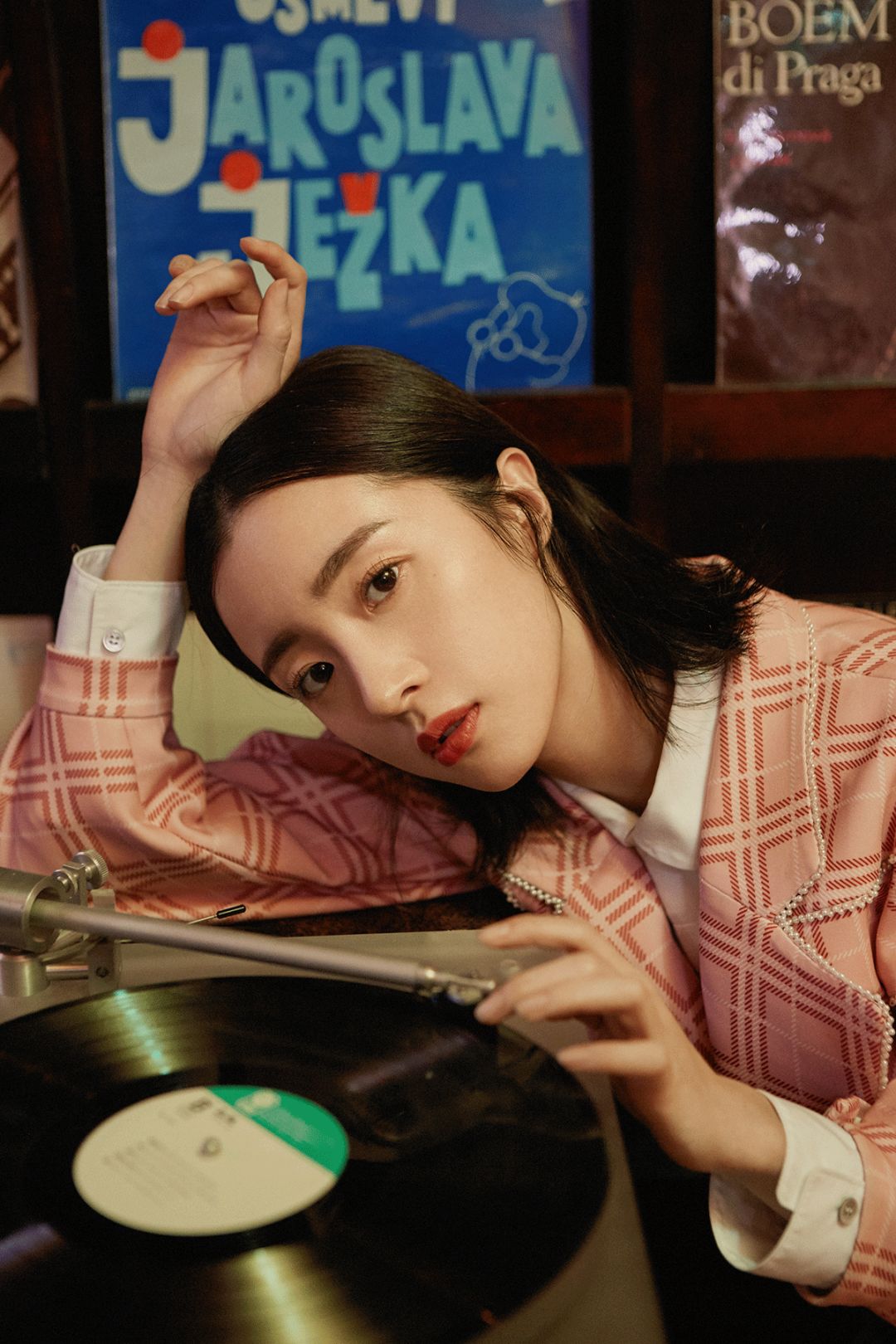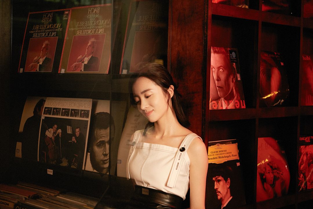 木质结构的建筑空间,几千张黑胶唱片,几百种威士忌,这样的环境里流淌着静谧的艺术气息,再一见到胡冰卿,我就知道这次拍摄来对了地方。有别于当下的现役小花们,清冷、脱俗,是她给我的第一印象。仿佛能把周围的一切带入沉静。这样气质的人置身在这样的环境中,像极了电影里的画面。
