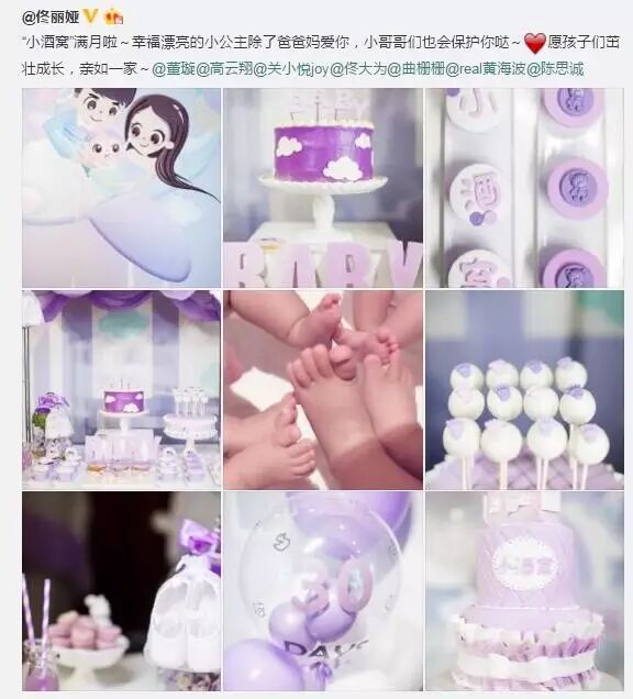 聚会结束后,高云翔夫妇的好友佟丽娅也在微博晒出一组董璇女儿满月宴现场照片,并发文称:“‘小酒窝’满月啦~幸福漂亮的小公主除了爸爸妈爱你,小哥哥们也会保护你哒~愿孩子们茁壮成长,亲如一家~”